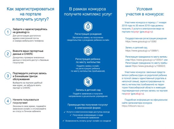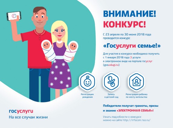 С 23 апреля по 30 июня 2018 года департамент информатизации организует проведение на территории города Новосибирска и Новосибирской области конкурса «Госуслуги семье!» среди граждан, заказавших комплекс услуг в электронном виде: регистрация рождения ребенка, запись в детский сад, регистрация ребенка по месту жительства (пребывания).